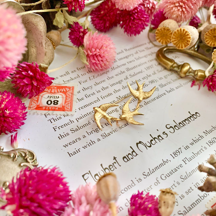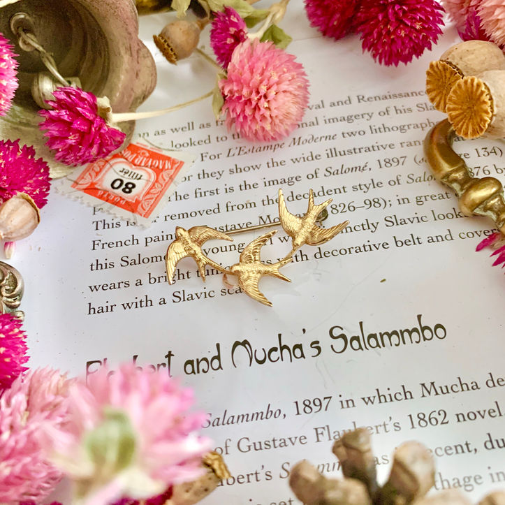 因為燕子是北方來的鳥,在古代又被稱為玄鳥。牠特有的剪刀尾配上有力的羽翅,在每年春末夏尾之間成群出現在人家的簷下築巢,因為傳說燕子會帶來福氣,所以總是能在路邊巷尾看見搧著扇子的老人家拐著凳子坐在走道,頭頂幾隻盤旋的飛燕,這是我小時候非常喜愛的景象之一。這只精巧細緻的胸針將玄鳥的形象刻的十分活靈活現,彷彿正於天際翱翔,聚睛仔細看時,會發現設計師連牠的嘴喙也細緻雕刻出來,將之別在胸前或領子上,特別生動,引人目光呢。